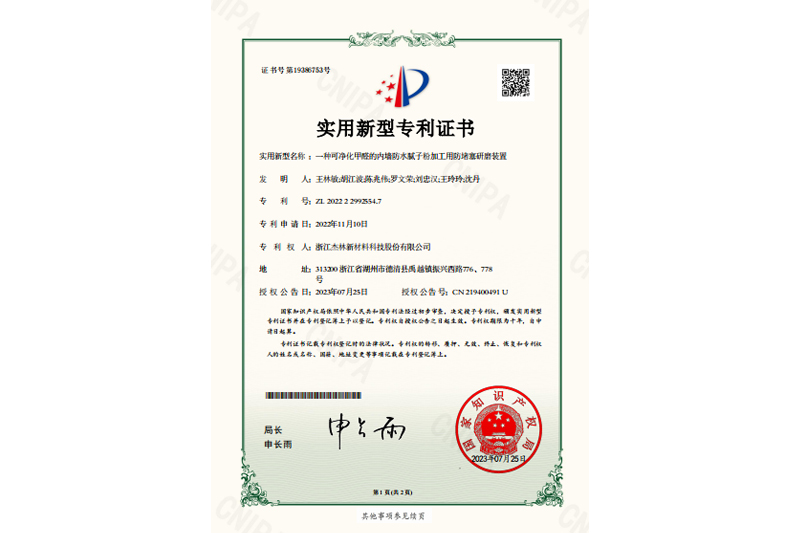 一種可凈化甲醛的內墻防水膩子粉加工用防堵塞研磨裝置-證書